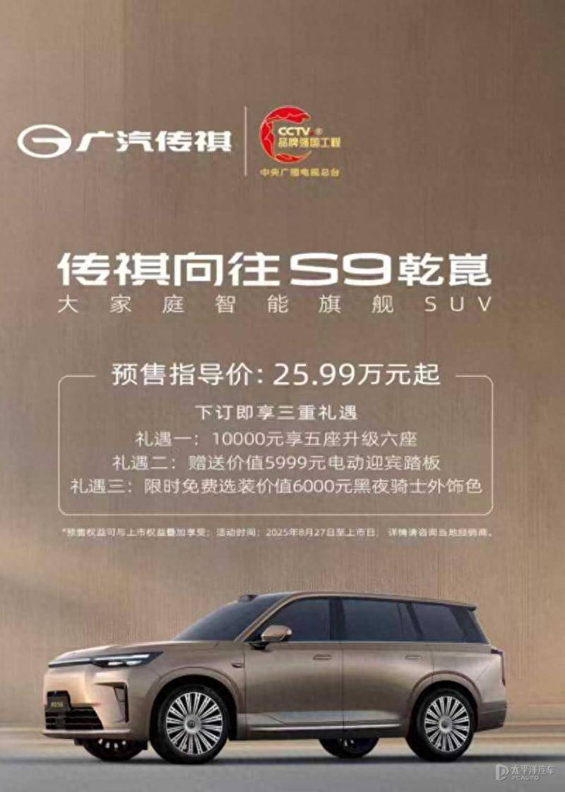 传祺向往S9乾崑系列车型预售价(万元)Max(5座)25.99Max(6座)26.99Ultra(5座)27.99Ultra(6座)28.99