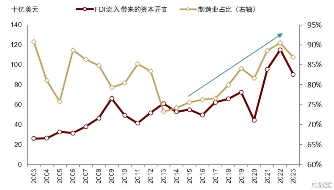 图表9:FDI流入带来的资本开支大幅走高,且显著集中在制造业