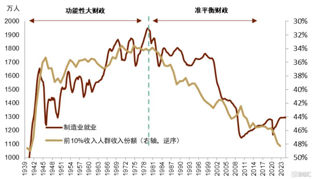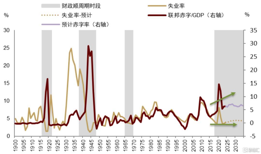 历史上看,如此悬殊的贫富分化往往加剧内部或外部摩擦。比如,特朗普发起的贸易摩擦从本质上看,可能是美国国内阶层矛盾外在化的体现方式。疫情以来美国持续顺周期大财政我们认为是其应对内外部摩擦加剧的手段。为应对内部摩擦加剧,通过持续大财政调节分配、回应选民呼声愈高的公平诉求;为应对外部压力加剧,通过财政主导与产业政策试图夯实国家安全。历史上,美国财政赤字率与失业率高度正相关,体现了财政的逆周期性,即经济疲软、失业率高企时,政府通过财政刺激提振经济。但在1916-1918年、1940年代、1966-68年,美国呈现显著的顺周期大财政:彼时美国失业率持续较低,但赤字率持续高位。自2018年以来,美国再次进入财政顺周期时期。按照赤字率与失业率的历史关系及这些年较低的失业率,美国“合理”的财政赤字率应当是3%-4%,而非这些年持续的6%-7%。这意味着,这些年的财政政策不单单出于经济因素,可能更有安全和公平的考虑;而要将资源引向安全和公平,脱虚向实则是一条必经之路。