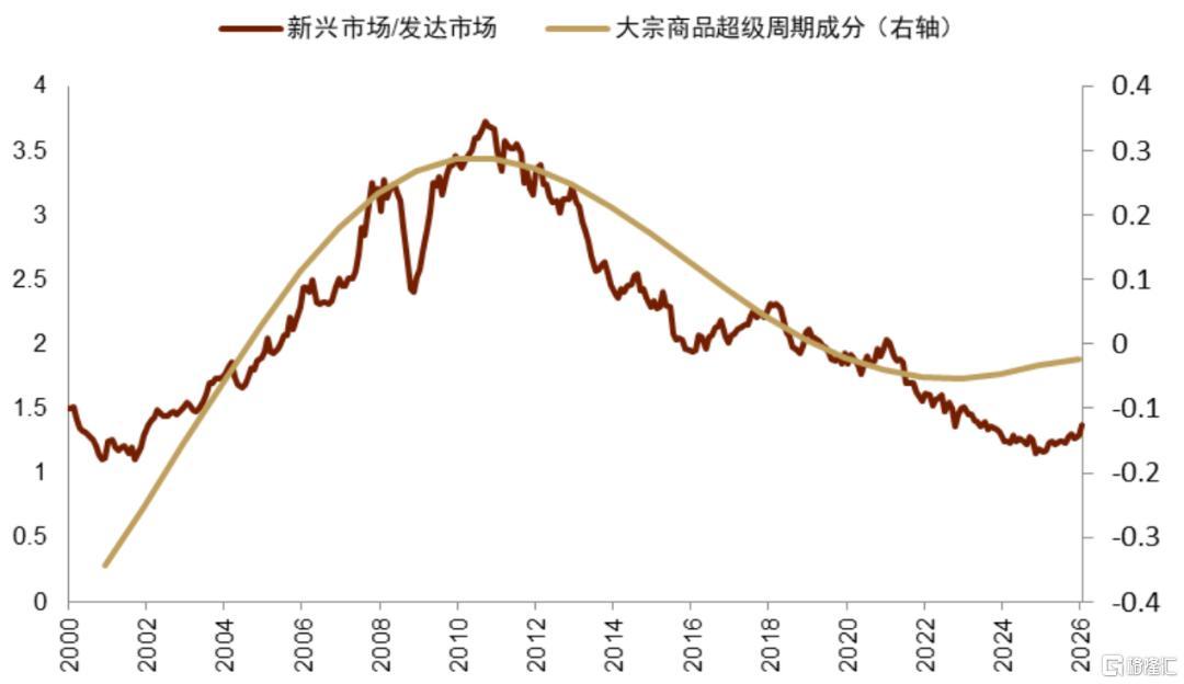 跨国来看,我们继续坚定看好非美跑赢美股。金融危机后,伴随美元趋势升值,美股显著跑赢非美,这一趋势在2025年初发生了逆转,我们判断该趋势有望延续。历史上,大宗商品超级周期下,全球投资与工业需求较旺盛,新兴市场往往表现更出色。