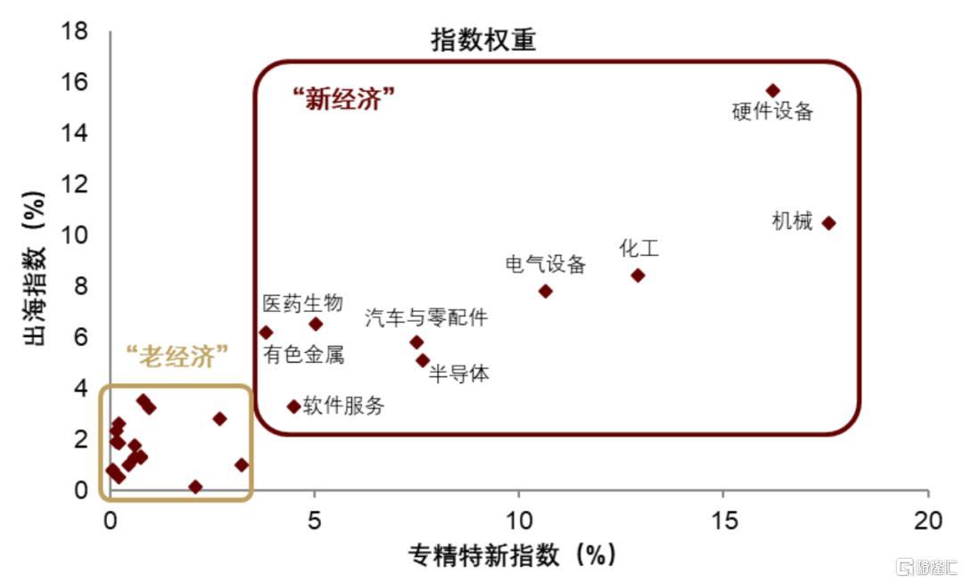 注:指数权重为Wind专精特新指数和出海指数的Wind二级行业分类权重,红框内的9个行业定义为“新经济”,其余为“老经济” 资料来源:Wind,中金公司研究部