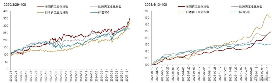 注:美、欧再工业化指数基于美股和欧股制造、国防、原材料、能源等行业龙头企业编制,日本为OPPJ指数 资料来源:Bloomberg,中金公司研究部