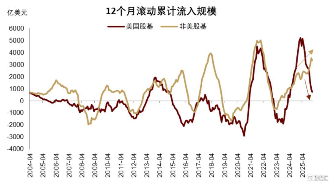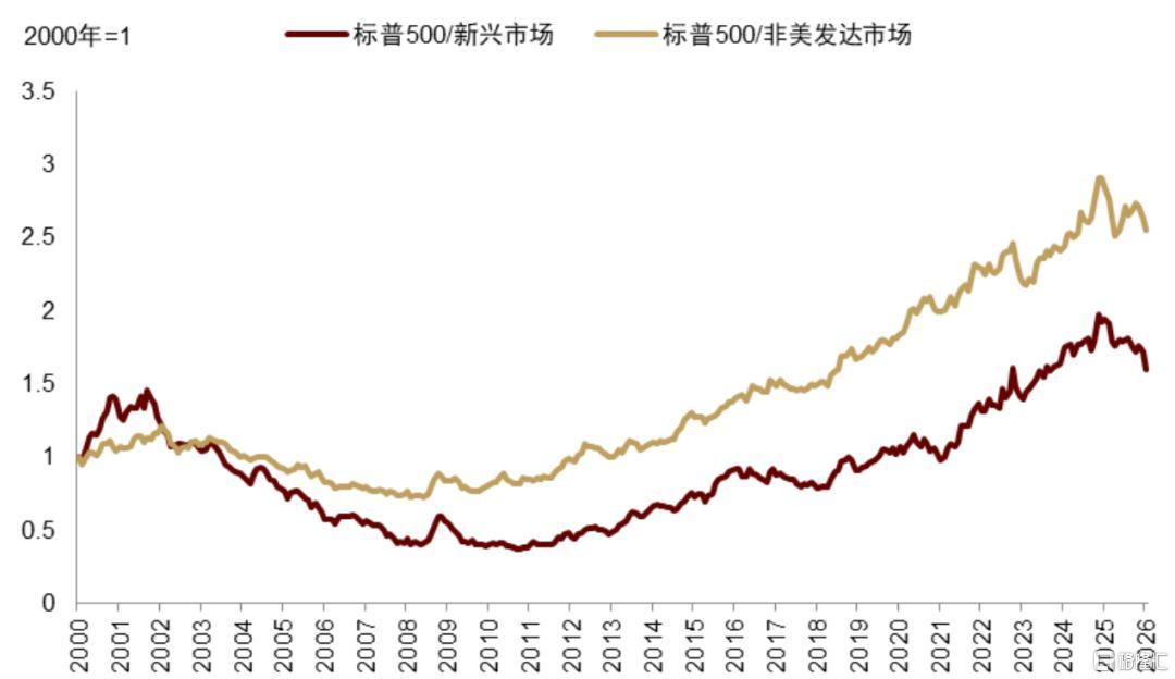 2025年,美元“一鲸落,万物生”,全球股市从“美股例外论”转向百花齐放,金银铜等有色金属也开启超级周期。新兴市场和非美股市分别跑赢标普500达14.49和9.41个点,考虑到美元大幅贬值,非美股市则跑赢更多。同时,资金在美国vs非美之间趋势性再平衡。