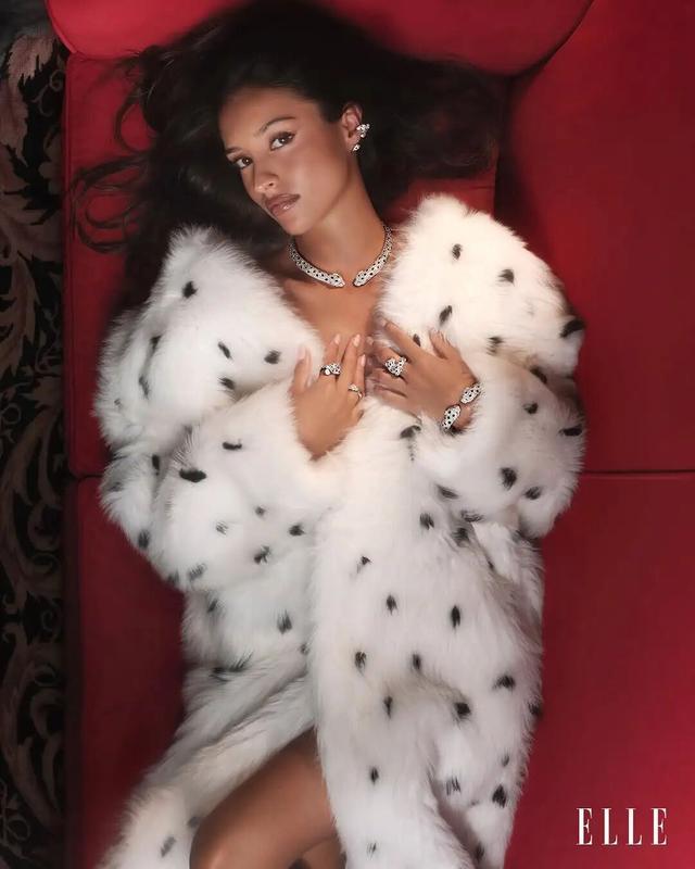 前阵子拍ELLE杂志大片,还佩戴了卡地亚猎豹高珠,搭配黑白皮草,画风很贵妇。