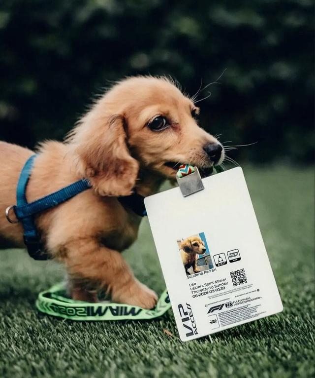 勒克莱尔对Leo十分宠爱,2024年迈阿密站,专门给它办了一张带照片的正式通行证,成为了全世界唯一拥有专属F1 Paddock Pass的狗。