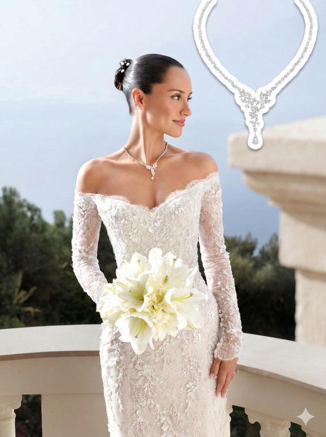Alexandra当天佩戴品牌标志性的Classic Butterfly钻石项链,颈间层叠的钻石蝴蝶仿佛在光影间振翅欲飞,同时呼应婚纱上的蝴蝶,宛如仙子。