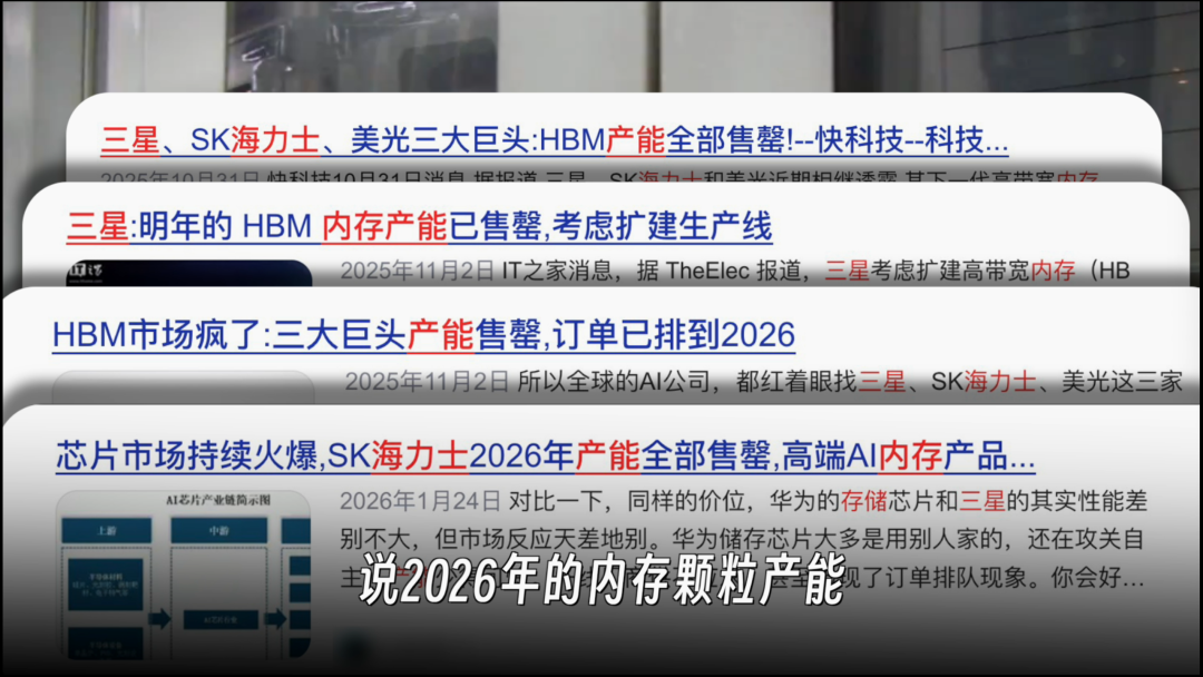 紧接着,三星、海力士就官宣2026年的内存颗粒产能已经全部售罄,还立刻调整了产能,把重心全部转移到了服务器级别的HBM内存上。
